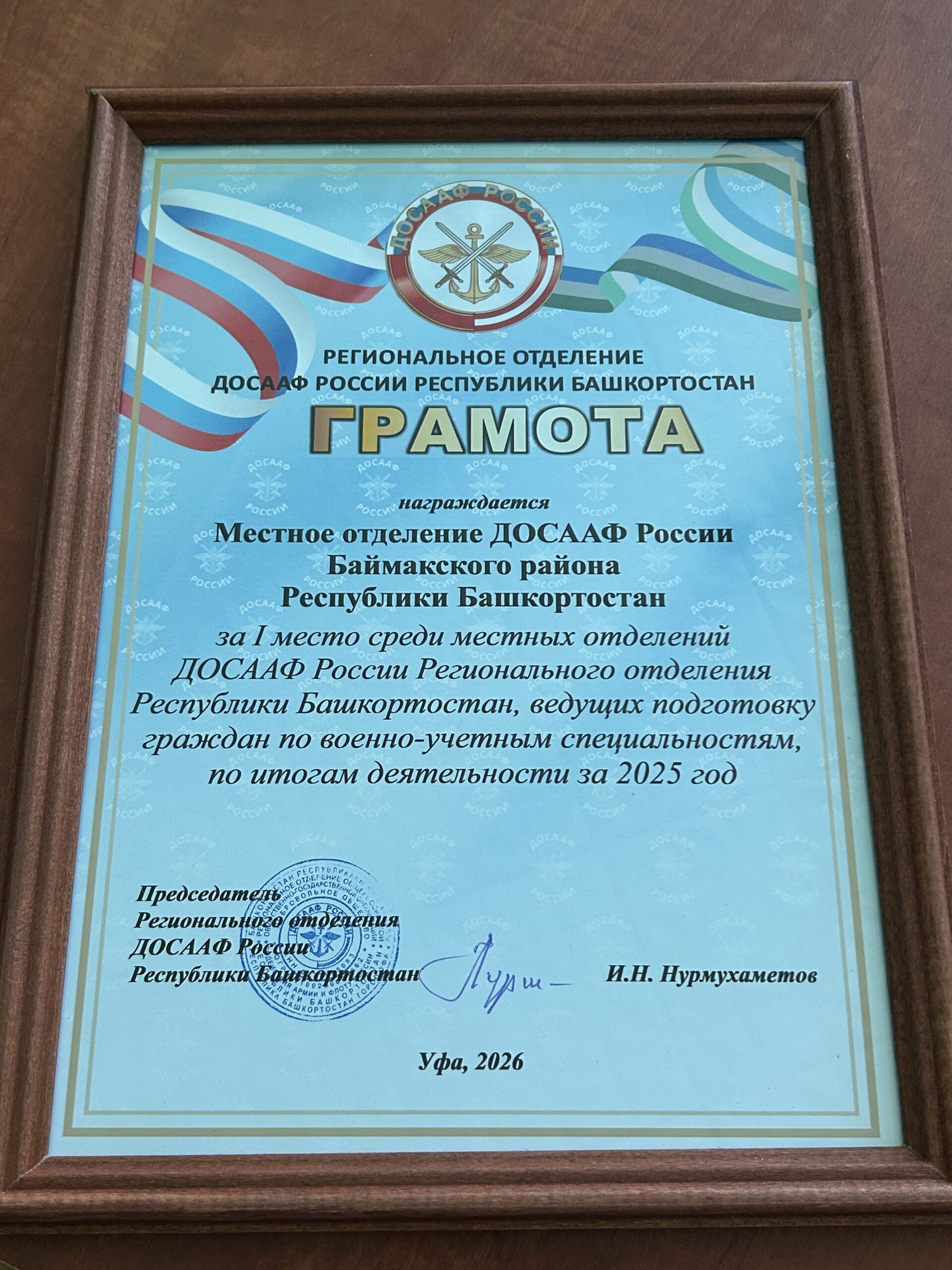Второй год подряд Местное отделение ДОСААФ Баймакского района Республики Башкортостан награждается штандартом и грамотой Регионального...